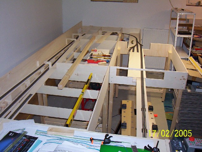 Hier möchte ich etwas über mein Hobby Modelleisenbahn erzählen. Als Kind bekam ich langsam aber stetig eine Modelleisenbahn von Fleischmann (GFN) in H0 geschenkt. Die Anlage erreichte auf einer Platte eine Ausdehnung von 2,10 x 1,40 m. Sie wurde analog betrieben und war aus dem GFN Modellgleis aufgebaut. Die Oberleitung von Vollmer schaffte es nicht mehr so weit, meine BR 103 in einem Kreis mit Strom zu versorgen. Da der Kellerraum nicht beheizt werden konnte war das Spielen mit der MoBa im Winter auch nicht so angesagt. Bei einem Hochwasser wurde fast der gesamte Fuhrpark geflutet - danach staubte die Anlage so vor sich hin. :-( Vor vielen Jahren erbte ich von meinem Opa den Gleichstromteil seiner Sammlung. Diese Loks verschwanden erst mal in Schränken. Bei einem MoBa-Händler in Wunstorf bin ich dann über einen größeren Posten gebrauchter Profigleise von GFN gestolpert. Da die Gleise recht günstig - aber in 1A-Qualität - waren, wurden ein paar Geraden und Kurven gekauft. Schließlich sollten die Loks mal getestet werden. Da das einfache Oval doch irgendwie langweilig war und meine Freundin die Loks auch toll fand wurden noch ein paar Gleise und Weichen besorgt - und noch ein paar - und noch ein paar.... Auf der Suche nach Informationen bin ich auf die News-Gruppe de.rec.modelle.bahn gestoßen, die mir sehr viele gute Informationen und Tipps liefert. Zwischenzeitlich hatte ich auch einen eigenen, beheizbaren Keller. Nach dem dieser ausgeräumt war konnte es mit dem Bau der Anlage unter großer Anteilnahme von Paul und Benni losgehen. Recht schnell war klar, dass es als Untergestell eine Rahmenbauweise werden sollte. Gebaut wurde mit 10mm Pappelsperrholz, welches der örtliche Baumarkt gleich auf die passenden Maße zuschnitt. Die Stützen wurden aus 44 x 44mm Kiefer-Balken geschnitten. Um Höhenunterschiede auszugleichen, habe ich unten mit Hilfe von Einschlagmuttern Bodenausgleichsschrauben angebracht. Und so wuchs die Anlage Stück um Stück, obwohl der Gleisplan noch nicht endgültig durchdacht war. Aber der Spieltrieb wollte auch befriedigt werden. Viele Planungen wurden auch anhand von Stellproben überprüft. Der umfangreiche Fuhrpark konnte es kaum noch erwarten, dass die Strecken freigegeben wurden. Doch die größte Herausforderung sollte die Verdrahtung der Anlage werden. Diese Aufgabe beschäftigt mich bis Heute und nimmt einen beachtlichen Teil des Budgets ein. Die Ausstattung der Steuerung habe ich hier aufgelistet. Das Grundprinzip war recht einfach angedacht. Für eine optimale Überwachung und Steuerung der Betriebsabläufe wurde die Anlage in viele kleine Rückmelde-Abschnitte eingeteilt. Nach Möglichkeit stellte jede weiche einen eigenen Rückmelde-Abschnitt dar. um den Verdrahtungsaufwand in Grenzen zu halten habe ich mich für 8fach-Rückmeldemodule von Viessmann mit Optokopplern entschieden. Diese wurden unterhalb der zu überwachenden Gleisabschnitte angebracht und mit dem S88-bus verbunden. Auch wenn der S88-Bus recht umstritten ist, so kann ich bis jetzt keine Nachteile erkennen. Die viel berichteten Probleme kann ich auch nicht nachvollziehen. Allerdings setze ich das Flachbandkabel nur in der maximalen Länge von 15 cm ein. Größere Strecken werden mit verdrilltem Rundkabel - zum Teil mit Schirmung - überwunden. Zum Schalten werden dezentrale angebrachte 4fach-Schaltdecoder von LDT eingesetzt. Der Schaltstrom wird von einem separaten Trafo zur Verfügung gestellt, um den "teuren" Digitalstrom ausschließlich zum Fahren verfügbar zu haben. |